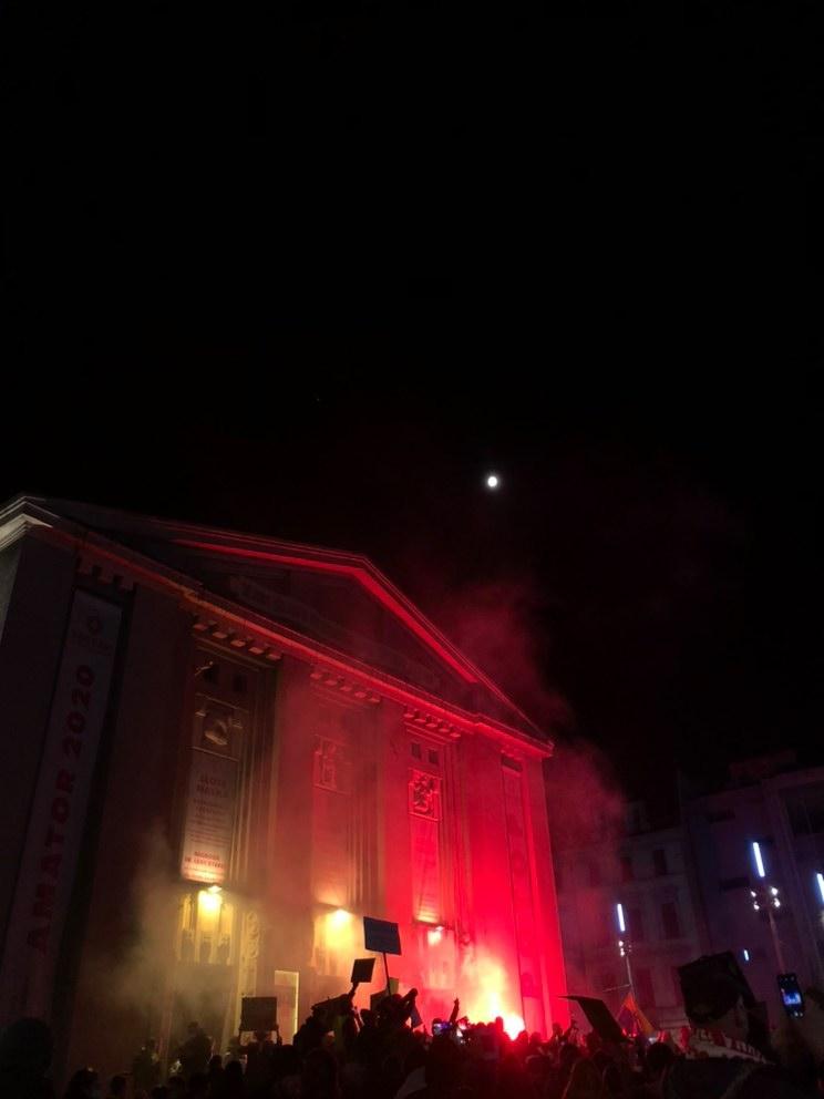 - Thousands of people with banners and red flares protesting against the new anti-abortion regulations in front of a theatre house in Katowice, Poland [Zuzanna Kozłowska]